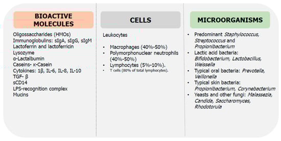 Leukocytes. Activated live leukocytes are present in BM, including macrophages (40–50% of total leukocytes), polymorphonuclear neutrophils (40–50% of total leukocytes), and lymphocytes (5–10% of total leukocytes) [187]. Leukocytes concentrations are the highest in colostrum and decrease gradually. If the mother or infant suffers an infection, leukocytes levels can increase to 97% of the total cells in BM [188]. The lymphocytes population consists mainly of T cells (approximately 80%), where most of them are activated, motile, and interactive, thus suggesting that they confer active immunity to the infant. In addition, leukocytes, particularly polymorphonuclear, offer protection to the mammary gland under mastitis infections [189].