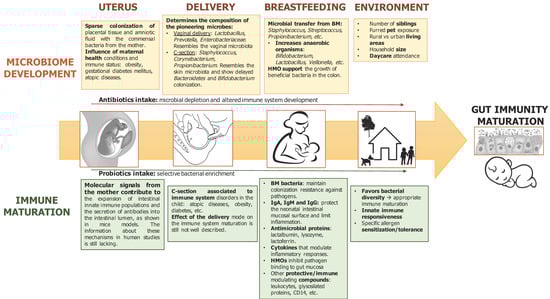 The most relevant post-natal factor that supports an adequate microbial colonization and drives the immune system maturation is breastfeeding [139,140,141]. Compared with formula feeding, breastfeeding has been associated with decreased morbidity and mortality in infants, and to lower incidence of gastrointestinal infections and inflammatory, respiratory, and allergic diseases [141,142,143,144].