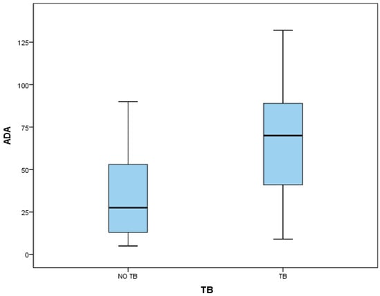 Figure 1). The mean age in the TB group was 40 (±10) years and 41 (±10) years in the non-TB group; 19 (76%) patients were male in the TB group and 13 (72%) in the non-TB group. Non-differences were observed in fluid characteristics in pH (7.39 ± 0.07 vs. 7.41 ± 0.13), glucose (66 mg/dL ± 27 vs. 83 mg/dL ± 26), proteins (3.95 g/dL ± 1.15 vs. 3.27 g/dL ± 1.47), lactate dehydrogenase (LDH, 882 mmol/L ± 497 vs. 1046 ± 635), and leukocytes (1173/mm