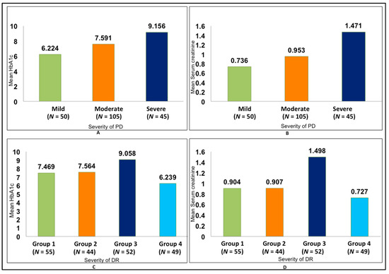 Association between glycated haemoglobin (HbA1c) and serum creatinine with DR and PD. (A) Comparison of mean HbA1c with PD. (B) Comparison of mean serum creatinine with PD. (C) Comparison of mean HbA1c with DR. (D) Comparison of mean serum creatinine with DR.
