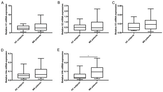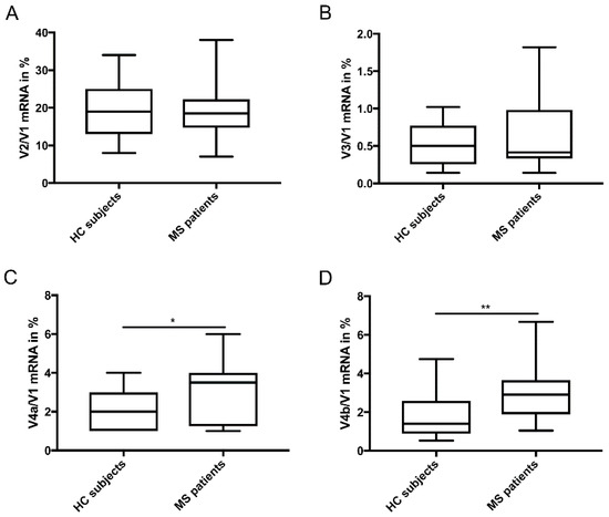 Furthermore, analysis of splice variant expression in relation to full-length V1 mRNA (Figure 2A–D) showed that the percentage of V4a and V4b expression in relation to V1 mRNA was significantly higher in PP-MS patients compared to HC subjects (p = 0.013 and p= 0.003, respectively) (Figure 2C,D).