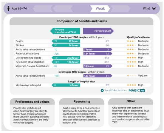 The arrival of Transcatheter Aortic Valve Implantation (TAVI), with delivery of the replacement valve through the femoral artery, created a new, minimally invasive option. The resulting TAVI or SAVR decision was the first addressed by the newly-launched collaboration between Grading of Recommendations Assessment, Development and Evaluation (GRADE), Making GRADE the Irresistible Choice (MAGIC), and the British Medical Journal (BMJ) (hereafter GRADE+) to produce and publish ‘trustworthy recommendations … in response to potentially practice changing evidence, so called ‘Rapid Recommendations’ [1] (p. 2).