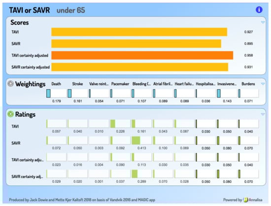 A sample of the Annalisa output screen appears in Figure 3. This example, for an under 65 year old, is one where a reasonable set of criterion importance Weightings and respondent-sourced performance Ratings produces an opinion favouring TAVI—in contrast to the strong SAVR recommendation for this age group.