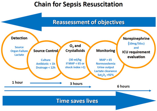 Chain for sepsis resuscitation that resumes the clinical algorithm for initial management of septic patients. ICU—intensive care unit; MAP—Mean Arterial Pressure.