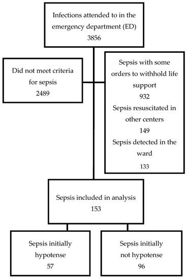 The incidence of sepsis [1] in developed countries is over 200 cases/100,000 inhabitants per year [2,3,4], and about 50 cases of community-onset sepsis/100,000 inhabitants/year require admission to intensive care units (ICU) [5]. The outcomes and the use of healthcare resources for community-onset sepsis are influenced both by factors that cannot be modified (e.g., infection site, causal microorganism, and patient characteristics) and by other, time-dependent, factors that can be modified, mainly early appropriate infection control and hemodynamic resuscitation [6]. Delayed or inappropriate resuscitation or infection-control measures are strongly associated with increased morbidity and mortality [7,8]. The heterogeneous clinical presentation of community-onset sepsis can make it difficult to detect, thus delaying the application of therapeutic measures and increasing mortality. We analyzed how the clinical presentation affects the management of patients with community-onset sepsis in our emergency department. Our main objective was to determine the effect of the absence of initial hypotension on emergency department management, and accordingly the impact on clinical evolution.