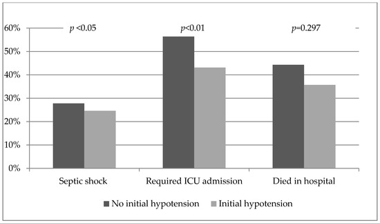 Although the group of patients who were hypotensive at admission had higher initial lactate concentrations, lactate concentrations measured six hours after admission did not differ between the two groups. Fewer patients in the group with initial hypotension, compared to the group without initial hypotension, required admission to the ICU (43% vs. 56.9%, respectively, p < 0.01). No significant differences in hospital mortality were observed between the two groups (35.7% in the group with initial hypotension vs. 44.3% in the group without initial hypotension, p = 0.297) (Figure 3).