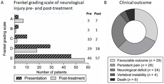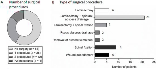 - Rossbach, B.P.; Niethammer, T.R.; Paulus, A.C.; Melcher, C.; Birkenmaier, C.; Jansson, V.; Wegener, B. Surgical treatment of patients with spondylodiscitis and neurological deficits caused by spinal epidural abscess (SEA) is a predictor of clinical outcome. J. Spinal. Disord. Tech. 2014, 27, 395–400. [Google Scholar] [CrossRef] [PubMed]