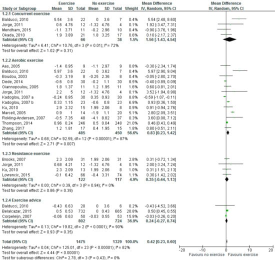 However, the present study has several limitations. The risk of bias could not be assessed across many of the preset criteria. In addition, high study heterogeneity was found, and could not be fully explained in the subgroup analyses. Furthermore, the population set analyzed was heterogeneous in terms of age distribution, BMI, and clinical condition. Also, the design of physical exercise interventions differed, e.g., in terms of session duration and intensity. For aerobic exercise, we could not make a differentiation between potentially different effects of interval vs. continuous exercise. Some studies also had very small study groups, which tends to produce more extreme effects. Publication bias could also not be excluded.
