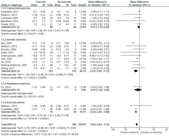 With regards to effects of different exercise modalities, aerobic exercise significantly increased adiponectin levels (MD: 0.83 µg/mL; 95% CI, 0.23, 1.42, p = 0.007, I2 = 89%), but neither concurrent/resistance exercise nor exercise advice significantly affected adiponectin levels. With regards to leptin levels, both aerobic exercise (MD: −2.55; 95% CI, −3.99, −1.12, p = 0.0005, I2 = 65%) and exercise advice (MD: −2.42; 95% CI, −2.86, −1.98, p < 0.00001, I2 = 0%) led to a significant reduction in serum levels.