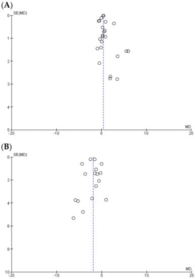 Publication bias was inspected through the funnel plot method, where the differences in mean changes are plotted against their standard errors, in order to determine the precision of the studies.