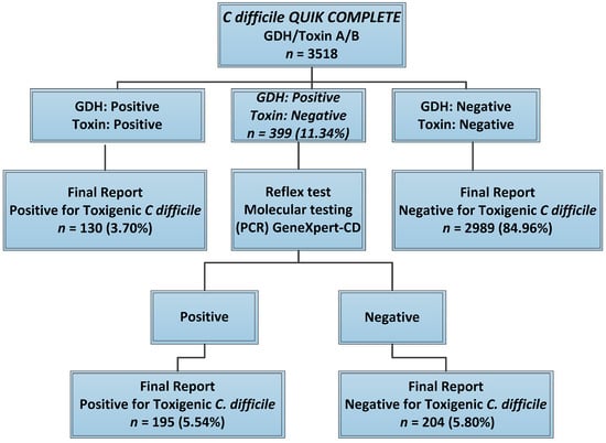 - Culbreath, K.; Ager, E.; Nemeyer, R.J.; Kerr, A.; Gilligan, P.H. Evolution of testing algorithms at a university hospital for detection of Clostridium difficile infections. J. Clin. Microbiol. 2012, 50, 3073–3076. [Google Scholar] [CrossRef]
