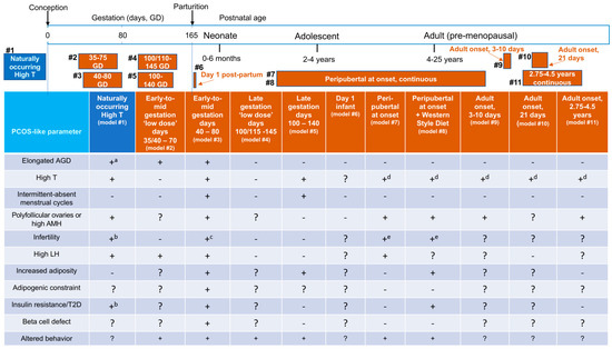 Experimentally induced, early-to-mid gestation T exposure (model #3, Figure 1, Table 3) generates the most comprehensive reproductive, neuroendocrine and metabolic phenotypic mimic of PCOS, followed closely by naturally occurring hyperandrogenism (with hypothetical mid-gestation onset of hyperandrogenism [13]), and then experimentally induced, peripubertal onset of lifetime exogenous T exposure supplemented with high-fat (Western style) diet (model #8, Figure 1, Table 3). While the remaining macaque models are less compelling, all except the infant model (model # 6, Figure 1, Table 3) exhibit at least two core tenets of a PCOS diagnosis. From this perspective, it becomes clear why macaque models are clinically recognized as providing “a paradigm shift in concepts about the pathogenesis of the disorder” since they have generated key “insight that prenatal exposure to androgens can reproduce most of the features of the human syndrome in primates” [110].