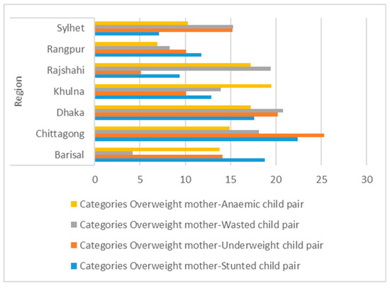 Khulna had almost 20% overweight mothers with anaemic children, which was highest among the seven regions. Rural households had a high number of overweight mothers with anaemic children. Fathers working in services had a high number of overweight mothers with anaemic children. More than 80% of the unemployed mothers were overweight with anaemic children.