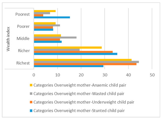 The present paper observed the existence of a double burden of malnutrition in the same household. Overweight mothers with undernourished (stunted/underweight/wasted) children were found under the same roof. When the effects of all other variables were removed, the double burden of malnutrition was significantly associated with region, wealth index, and father’s/husband’s occupation. Overweight mothers and undernourished children were more evident in the richest households (Figure 3). The prevalence of malnourished mother and anaemic children improved with an improvement of drinking water quality. Overweight mothers with anaemic children were 27% more likely to use piped water as the source of their drinking water.