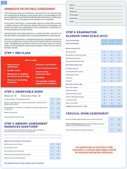 A standardized framework helps guide providers in balancing the subjective elements of SRC diagnosis. Efforts to adopt a uniform protocol began in 1997 with the standard assessment of concussion (SAC) [14], which measures orientation, immediate memory, concentration, and delayed recall, and, when compared with a baseline score, has been found to have high sensitivity and specificity for diagnosing SRC [15,16]. Today, perhaps the most well-known and comprehensive evaluation is the sports cognitive assessment tool (SCAT), which has undergone several iterations to optimize its power and utility. Of note, the SCAT includes the aforementioned SAC. The SCAT5 is the most recent version and starts with an immediate on-field assessment, which sequentially involves identification of red flags warranting immediate medical attention, observable signs, orientation assessment (Maddocks questions), GCS, cognitive assessment (SAC), postural stability, and a cervical spine assessment (Figure 1). The entire SCAT5 is lengthy and not administered entirely on the sideline, but elements can be used immediately, saving the rest for a more controlled environmental setting (e.g., locker room or office examination room).