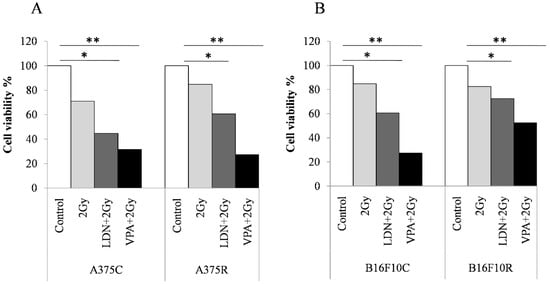 The parental and drug-resistant cells of A375 and B16F10 cell lines were pretreated with an IC25 concentration of VPA (0.75–1.33 mM) and LDN193189 (0.78–1.5 μM) for 24 h and irradiated with 2.0 Gy radiation. The clinically safe dose of VPA is about 1–1.5 mM for radiation sensitization. Different doses have been used. For instance, Van Nifterik et al. (2012) used 0–2.5–5–7.5 mM, while Yarmohamadi et al. (2018) used 0.5–64 mM for sensitizing cancer cells to radiation [29,30].