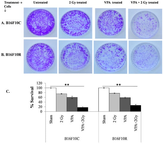 The clonogenic survival assay also confirmed that the pretreatment of a low dose of VPA (2 mM) followed by exposure to low dose of radiation (2 Gy) increased cell death significantly (with statistical significance p < 0.001) in B16F10C and B16F10R cells (Figure 4A,B). The cell death was synergistic in the VPA pretreated + 2 Gy exposed cells (Figure 4C).