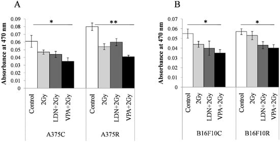 Content in the resistant cells sensitized with VPA/LDN193189 before radiation. Cells were pretreated with IC25 dose of VPA or LDN193189 and were irradiated. After 24 h of incubation, the flask containing cells were irradiated with gamma radiation (GC-5000, BRIT Mumbai) at the CARRT, Mangalore University, at a dose rate of 8.8 Gy/min for 14 s (equivalent to 2 Gy) at room temperature and cells were further incubated with drugs for 24 h. Following incubation, cells were lysed and the color due to melanin release was measured at 470 nm. Respective sham irradiation and control (untreated) groups were used for comparison and data shown are mean ± standard deviation (SD) of three replicate wells. (A) shows the results on human melanoma A375and (B) shows the results on mouse melanoma B16F10. * p > 0.05, ** p > 0.001.