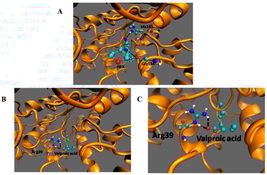 Among the listed interactions generated from PDBsum, two H-bonds involving His145 and Gly154 (Figure 6A) with an energy of −9.5 kcal/moL were generated between HDAC2 and its inhibitor IWX (used as a standard to check for reliability of the docking). The negative energy shows the stability of the interaction. There was no interaction between VPA and His145 and Gly146 of HDAC2 as seen in the case of the inhibitor IWX. However, valproic acid bound deeper in the enzyme and made an H-bond with Arg39 (Figure 6B,C). The interaction of HDAC2-VPA complex is stabilized by energies of −4.61 kcal/mol. This docking study shows that although the binding energy of VPA to HDAC2 is comparatively more than the interaction of IWX to HDAC2, VPA can make interactions with Arg39.