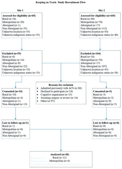 During the study period, 238 participants were screened including 18 Aboriginal and Torres Strait Islander people. Reasons for exclusion included: admitted previously with ACS (37% of the total and 16 of the potential Aboriginal people screened); people who declined to participate (10%); cognitive impairment (6%); awaiting surgery or review (5%) and other included being enrolled in another study (41%). At completion of the recruitment period, 19 participants had consented including two Aboriginal and Torres Strait Islander people. One of the Aboriginal participants was later lost to follow-up which left only one Aboriginal person participating, consequently this person’s data has not been reported separately (Figure 1). Although our intention was also to have 50:50 metropolitan to rural and remote, the final cohort included six (33.3%) metropolitan and 12 (66.6%) rural and remote participants.