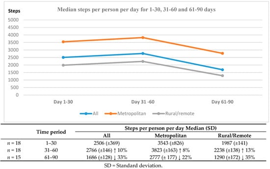 Total physical activity recorded for all participants in the was a median of 2506 (standard deviation (SD) ± 369) steps per day in the first 30 days, slightly higher for metro participants (median 3543 (SD ± 826) steps) and slightly less for rural participants (median 1987 (SD ± 141) steps). Two thousand five hundred steps per day was the equivalent of 20 min of walking or approximately 1.5 km (Figure 2).
