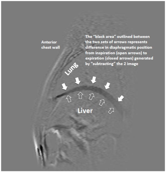 - Gierada, D.S.; Curtin, J.J.; Erickson, S.J.; Prost, R.W.; Standt, J.A.; Goodman, L.R. Diaphragm motion: Fast gradient-recalled-echo MR imaging in healthy subjects. Radiology 1995, 194, 879–884. [Google Scholar] [CrossRef] [PubMed]