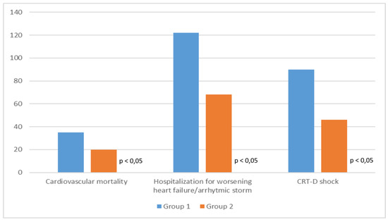Comparing the two groups, Group 2 have lower cardiovascular mortality, heart failure-related hospitalization, and arrhythmic events than Group 1 (Figure 1 and Figure 2).