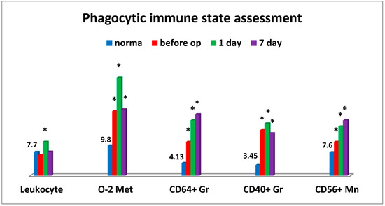 Evaluation of phagocytic immune unit. Legend: O-2 Met = oxygenic metabolism; conditional unit/1000 Nph = neutrophils; % Gr = granulocytes; Mn = monocytes; Leukocyte = billion/L; op = operation; * significance of differences between groups in all figures are reliable when P < 0.01 or P < 0.001.