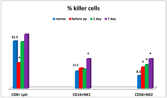 Moreover, the sharp decrease in CD4+/CD8+ ratio was also observed at the preoperative stage in connection with humoral immune deficiency (IgM), thus being indicative of the evident inflammation state and enhanced migration of T-lymphocytes to tumor sites. Severe cytotoxic T lymphocyte deficiency and elevated levels of natural killer cells No. 2 (CD56) were found at the preoperative stage. At that stage, the levels of natural killer cells No. 1 (CD16) (Figure 2), natural killer cells as effector cells (CD56+CD16+), and natural killer cells as regulator cells (CD56+CD16-) were sufficient (not shown).