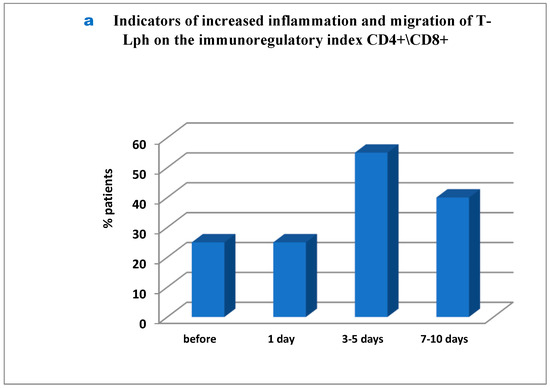 Indicators of enhanced inflammation and migration of T-lymphocytes in patients after cryo-destruction. Legend: T-Lph = T-lymphocytes; number of days = after operation. Patient depletion of the immune system—evaluation performed to raise and lower immune indexes) were recorded prior to surgery.