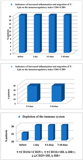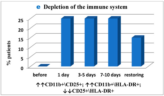 Interesting but so far controversial findings were obtained in the analysis of several immune ratios responsible for basic mechanisms used in the immune system. First, it was found that before surgery as much as 25% of patients showed severe inflammation and migration of T-lymphocytes into tumor sites. Additionally, on day 1 post-surgery the percentage of such patients remained unchanged, whereas on day 3 to 5 the number of patients amounted to 55% and remained as much as 40% on day 7 to 10 (Figure 3a–c). It should be noted that as much as 20% of patients showed the inflammation signs throughout the study (before surgery and close to the day of discharge; Figure 3b), while in 35% of patients the inflammation markers were registered from day 3 to day 10 post surgery (Figure 3c). The inflammation was inhibited and activated T-cell migration was balanced in 5% of patients only (not showed in Figure). Secondly, similarly to the first case, in 25% of patients signs of initial immune exhaustion and its functional activity suppression were observed in unchanged amount of 30% throughout the period post-surgery up to the day of patient discharge (Figure 3d), while in 25% these signs appeared only post-surgery and remained unchanged to the end of the study (Figure 3e). The immune system was normalized, and its functional activity was balanced by the end of the study in 15% of the patients only (Figure 3e).