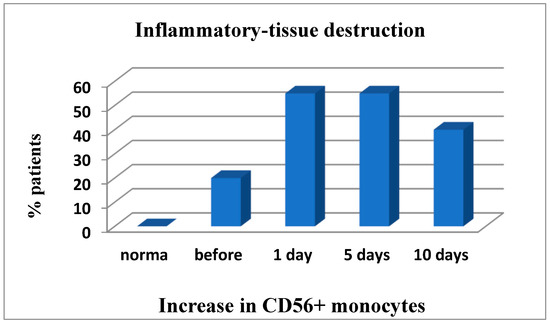 However, in 20% of patients inflammatory tissue-damaging processes (increased CD56+ monocytes (Figure 4); Patient depletion of the immune system—evaluation performed to raise and lower immune indexes) were recorded prior to surgery, but on day 1 to 5 post surgery the inflammation developed further and was already reported in 55% of patients and remained severe in 40% of patients by the end of the study (Figure 4).
