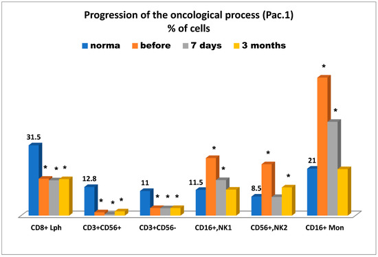 Progression of the oncological process in Patient 1; percentage of cells. Legend: * significance of differences; Lph = lymphocytes; Mon = monocytes; NK = natural killer cells; CD8 = cytotoxic T8-Lph; CD3+CD56+ = natural killer effector; CD3+CD56 = natural killer regulator; CD16+ Mon = Monocyte K-cell; number of days and months = after operation.