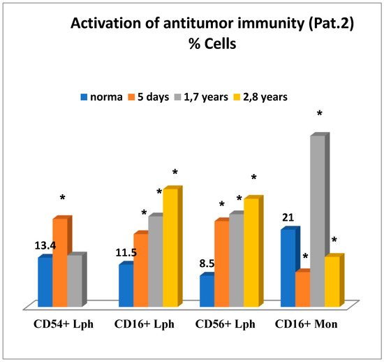 Activation of anti-tumor immunity in patient 2. Legend: * significance of differences; Lph = lymphocytes; Mon = monocytes; number of days = after operation.