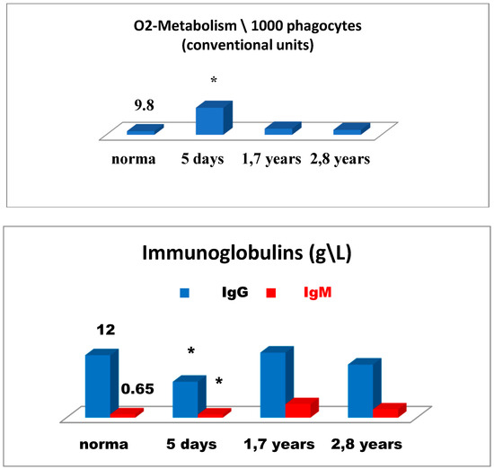 The analysis of three classes of immunoglobulins was performed with the monospecific antisera produced by Sinteko (Moscow, Russia), the method of turbidimetry, and a semiautomated biochemical Screen Master Plus analyzer (Hospitex Diagnostics S. A., Sesto Florentino, Italy) at a wavelength of 340 nm. Oxygen metabolism in phagocytic cells was analyzed (on a multiple Synergy 2 SLAD detector-analyzer, Winooski, Vermont, USA) with chemiluminescence (CL), adding luminol or lucigenin used to detect generated reactive oxygen species (ROS) to enhance the chemiluminescence reaction. According to some researchers, it is essential that the oxidation of lucigenin mainly helps identify the extracellular generation of superoxide radical, whereas luminol oxidation mainly identifies intracellular generation [13,14]. The reaction was conducted in wells using 150 μL luminol or lucigenin solution, 25 μL normal human serum (opsonized) zymosan suspension, and 5 μL whole blood of patients. Four repeated blood samples were used. The blood was extracted into standard tubes with EDTA, adhered on walls, and preserved before reaction at room temperature. First, the device was warmed up to the working condition under the standard program of analysis; when the temperature reached 37 °C, the blood samples were dissolved with initial mixing in four repeated plate wells for each patient before the plate was placed into the device. After that, the plate was placed into the device, and the CL (chemiluminescence) was analyzed for 50 min with 200-fold enhancement of the signal and a minimal interval of reading and shaking before each analysis in automatic mode. In the analysis, we used 96-well, flat-bottom, polystyrol plates.