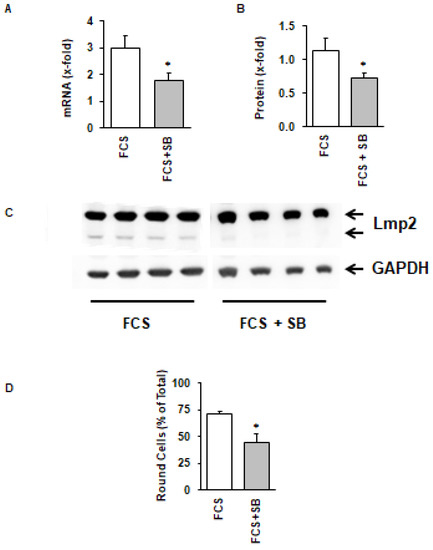 Effect of the p38 MAP kinase inhibitor SB202190 (SB) on LMP-2 mRNA expression (A), protein expression (B,C), and cell rounding (D) of cultured cardiomyocytes. Data are means ± SD from n = 4 preparations. *, p < 0.05 vs. FCS.