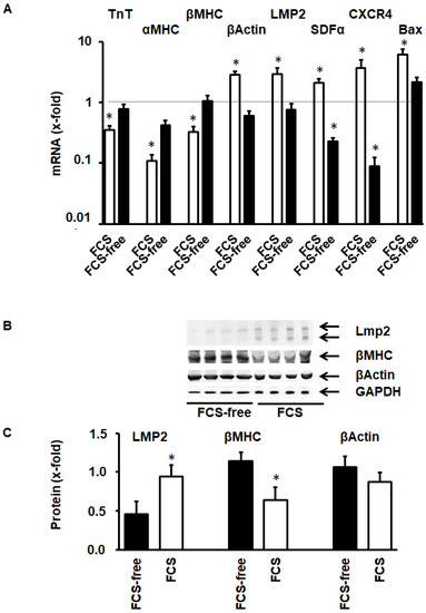 Cultivation of ARVC in serum-containing medium induces morphological adaptation to the culture dish. This was accompanied by molecular changes in the expression of cardiomyocyte specific proteins (Figure 5A). The mRNA expression of sarcomeric proteins like troponin T (TnT), α myosin heavy chain, and β myosin heavy chain was reduced, while that of the stress fiber protein β-actin was increased. Furthermore, LMP-2 was induced. LMP-2 is an inducible β subunit of the proteasome that is associated with an increased substrate turnover. Furthermore, serum cultivation induced the mRNA expression of stromal cell-derived factor (SDF) and CXCR4, the receptor for SDF. Bax, a pro-apoptotic protein, is also induced. The adaptation of ARVC to culture conditions requires protein degradation related to the induction of LMP-2 and reduction of the formation of sarcomeric proteins, like β-MHC. Transcriptional changes in the expression of these proteins was confirmed on the protein level, increased protein expression for LMP-2 (Figure 5B,C) and reduction of the sarcomere protein β-MHC (Figure 5B,C). The stress-fiber protein β-actin was not significantly induced at this time point.