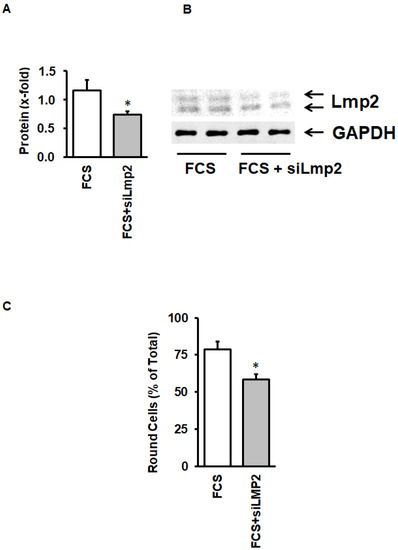 Effect of siRNA directed against LMP-2 on LMP-2 expression and cell rounding in cultured cardiomyocytes. (A) LMP-2 protein expression normalized to GAPDH; (B) Original Western Blot showing the expression of LMP-2; (C) Number of round cells after incubation with FCS or FCS and siRNA directed against LMP-2. Data are means ± SD from n = 5 preparations. *, p < 0.05 vs. FCS.