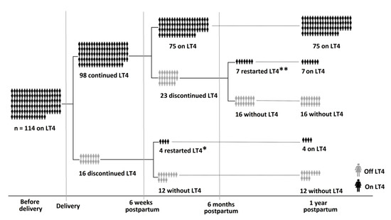 Flowchart of the 1-year postpartum follow-up. One year after delivery, most patients (86/114 (75.4%)) were still on levothyroxine treatment (LT4). In total, 11 out of 39 women who had discontinued LT4 after delivery, developed recurrence of subclinical hypothyroidism and reinitiated LT4. * In the first follow-up visit (6 weeks postpartum), 4 out of 16 women who had discontinued LT4 immediately after delivery, reinitiated it because of recurrence of hypothyroidism (mean ± SD TSH levels were 8.48 ± 2.77 mIU/L). ** In the second follow-up visit (6 months postpartum), another 7 out of 23 women who had discontinued LT4 after the first visit, reinitiated LT4 because of recurrence of hypothyroidism (mean ± SD TSH levels at 9.44 ± 7.21 mIU/L).
