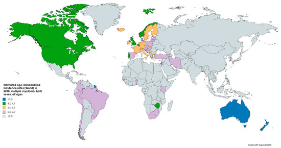 Map showing the estimated age-standardized incidence rates per 100,000 (world) in 2018 of multiple myeloma (MM) for both sexes and all ages. Created with mapchart.net. Data obtained from GLOBOCAN 2018 [7].
