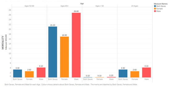 Bar chart showing the 5 year age-adjusted mortality rates from 2013–2017 by age for the United States. Created with Tableau 2019.2. Data source: SEER*Explorer [11].