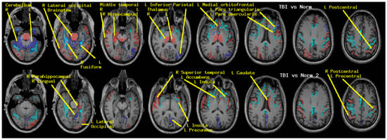 The regions whose neuroelectric activity values contributed to the cohort-specific classifiers reported in Table 5 and Table 6 are shown. The MRI slices range left to right, inferior to superior, in one-centimeter increments. The left side of each slice is the right brain. Activity in blue/red regions was higher/lower in the TEAM-TBI cohort. The cyan landmarks are the boundaries between gray and white matter in the precentral, cingulate, insula, and fusiform regions.
