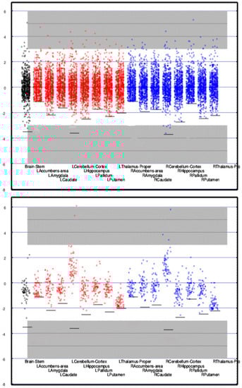 Regional activity (z-score) for 17 subcortical regions is shown for each CamCAN (upper panel) and TEAM-TBI (lower panel) subject. Since the means and standard deviations for the CamCAN subjects were used to compute the z-scores, the mean for each of the CamCAN regions is zero and the z-scores for each region are distributed approximately normally about zero. The mean and Scheme 3. 0 or z > 3.0—i.e., p < 0.0014. Individuals whose measures fall into those portions of the graph that are highlighted in gray are far from the norm. Note that assessing sub-mean normality is limited by the floor.