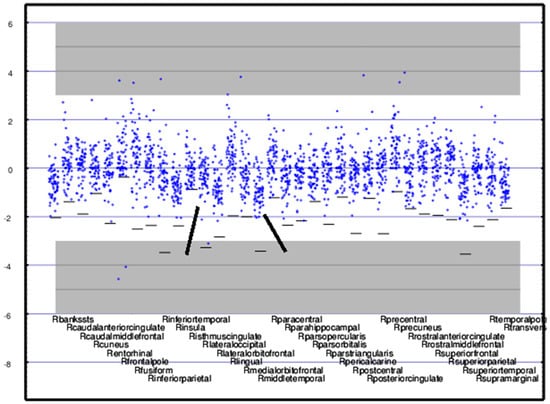 Lack of symmetry primarily results from the fact that each measure has a floor since each measure is a normalized count. The floor for each region is indicated in the figure with a horizontal bar. No individual’s measure for a region can fall below that bar; this results in bunching of the values below the mean. This is most pronounced for the accumbens regions for which the floor is only slightly more than one standard deviation below the mean.