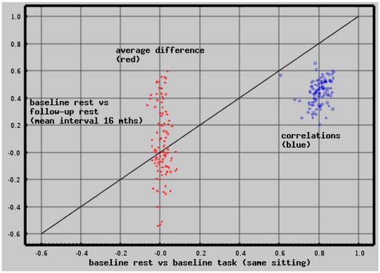 Short-term (same sitting) vs. long-term (mean 16-months) test-retest reliability is plotted for each of the 103 cortical, subcortical, and deep white matter regions. Regional measures (z-scores) of tonic neuroelectric activity were compared across all CamCAN subjects. Comparisons were between baseline resting and task recordings (short-term reliability, about one hour) and between baseline and follow-up resting recordings (long-term reliability, mean 16-month interval). Correlations (blue) and mean differences (red) are plotted—short term (x-axis) vs. long term (y-axis). Long-term test-retest reliability shows reduced correlations and increased differences. Note that mean differences >0.1 or <−0.1 are typically significant with p < 0.03.