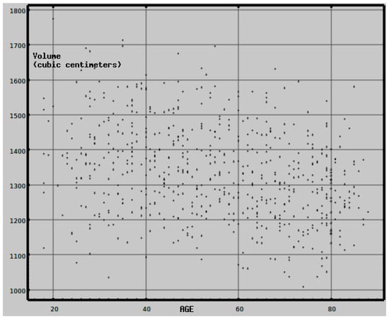 Each high-resolution T1 scan was processed with Freesurfer, version 5.3, using its default Desikan–Killiany atlas parcellation [10,11]. Freesurfer is a segmentation package which automatically and reliably identifies brain regions. The 3-dimensional coordinates of the extent of the brain volume and 153 standardized regions of interest (ROIs) were identified—68 cortical regions, 68 adjacent white matter rims of tissue with thickness ≤ 5.0 mm, and 17 subcortical regions. Figure 7 shows the expected descending relationship between brain volume and age.