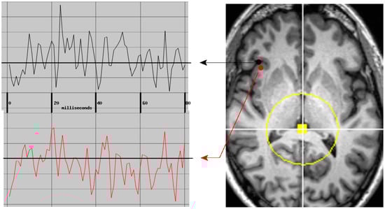 Two typical simultaneously active neuroelectric currents were identified and validated by the referee consensus solver, p < 10−12 for each—i.e., p < 10−4 for each when corrected for multiple comparisons. Each waveform has a duration of 80 msec sampled at 1000 Hz. The bandpass is 10–250 Hz. The currents are 5 mm apart with zero-lag cross-correlation of 0.157, df = 80, p = 0.16. The yellow dot and circle delineate the region near the center of the head which is excluded from the search for neuroelectric currents. See text for details.