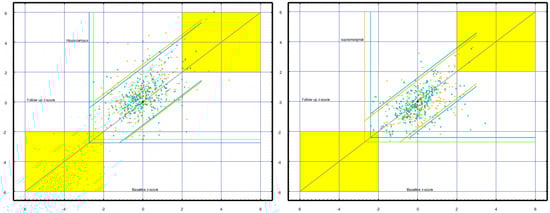 Left Panel—Atlas. Table (right)—good test-retest reliability. As for Table A1 and Table A3, Diff is the mean z-score difference: follow-up–baseline; mean interval is 16 months. Moderate significance (i.e., 0.03 > p > 0.002; −3.0 < t < 3.0) is indicated with italics; high significance (i.e., p < 0.002; t ≥ 3.0) is indicated in bold.