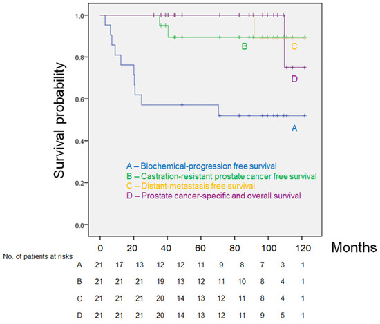 Twenty patients (95.3%) were alive at the end of the follow-up, and one patient (4.7%) had metastatic disease and died 109.7 months after the day of surgery. Eleven patients (52.4%) remained alive with no biochemical or clinical progression. Ten patients (47.6%) had biochemical progression. Two patients (9.5%) progressed to castration-resistant PCa (Figure 1). The 10 patients who had biochemical progression had subsequent therapies, including salvage radiotherapy, hormonal therapy, chemotherapy, or a combination of these therapies. The estimated five-year bPFS, distant metastasis-free survival, prostate cancer-specific survival, and overall survival (OS) rates were 57.1%, 89.4%, 100%, and 100%, respectively (Figure 1). Based on the pathologic changes of 21 patients, there were no significant differences in bPFS and OS between non-responders (Grade 0) and responders (Grade 1, 2, 3) (data not shown).