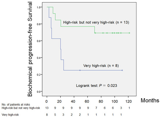 Comparison of biochemical progression-free survival between patients with high risk, but not very high risk PCa versus patients with very high risk PCa (p = 0.023).